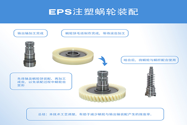 EPS注塑蝸輪裝配2023-12-02 說明:原裝配工序為將輸出軸與齒形加工完成的蝸輪裝配,裝配過程會引起齒形輕微變形,產(chǎn)生報廢率,調(diào)整裝配工藝后,確保了齒形精度,減少了報廢率。原裝配工序為將輸出軸與齒形加工完成的蝸輪裝配,裝配過程會引起齒形輕微變形